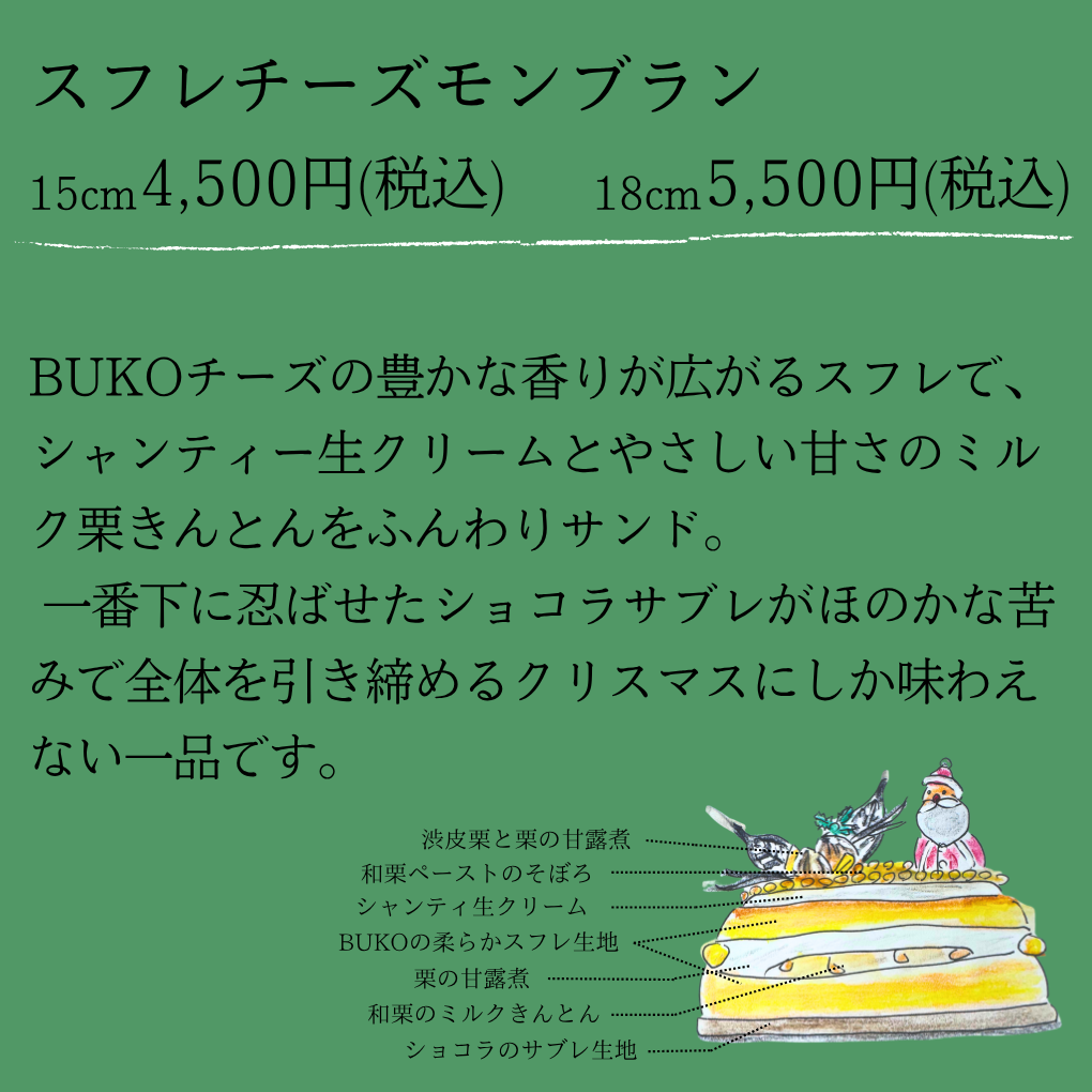 BUKOチーズの豊かな香りが広がるスフレで、シャンティー生クリームとやさしい甘さのミルク栗きんとんをふんわりサンド。